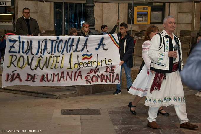 Sâmbătă, 3 decembrie, la ora 17.00, Plaça La Mare de Déu dels Desemparats sau, mai popular, Plaza de la Virgen, una din pieţele publice cele mai emblematice ale Valenciei, s-a umplut de coloritul inconfundabil al costumelor populare româneşti şi al drapelelor tricolore. Pentru a marca Ziua Naţională a României, Asociaţia Suflet Românesc – Alma Rumana a organizat, în colaborare cu Asociaţia Românilor din Valencia (AROVA) şi Grupul de dans popular românesc Datina, un flashmob cu tematică folclorică românească, o premieră în Spania, conform unui comunicat de presă venit din partea Asociaţiei Suflet Românesc – Alma Rumana.